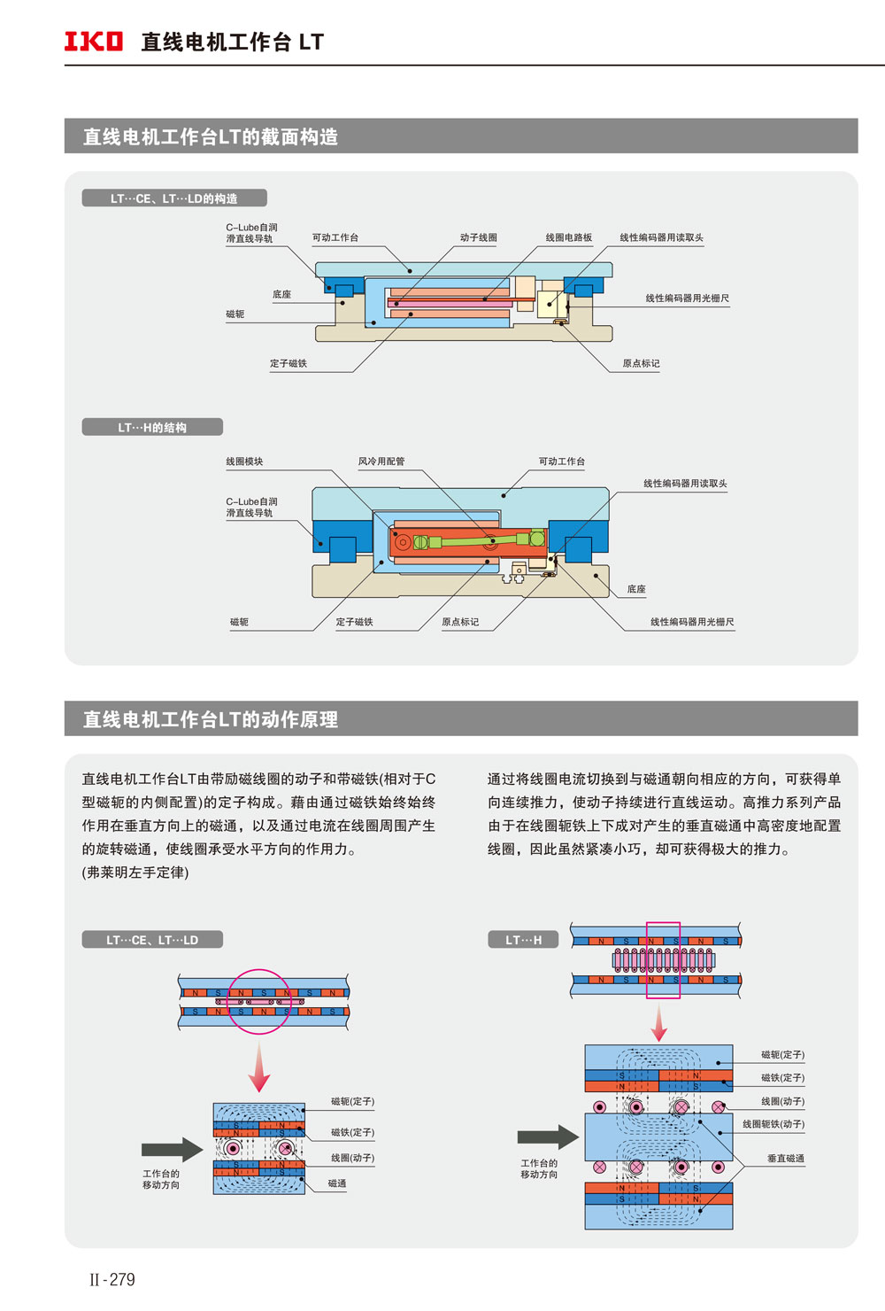由带励磁线圈的动子和带磁铁(相对于C型磁轭的内侧配置)的定子构成。借由通过磁铁始终作用在垂直方向上的磁通,以及通过电流在线圈周围产生的旋转磁通,使线圈承受水平方向的作用力。通过将线圈电流切换到与磁通朝向相应的方向,可获得单向连续推力。